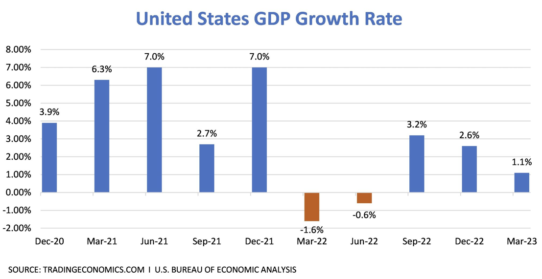 U.S. economic growth slowed in the first quarter to 1.1% after having notched 2.6% growth in the fourth quarter of 2022. Many economists expect the economy to slow even more as the year progresses, predicting a recession in the second half.