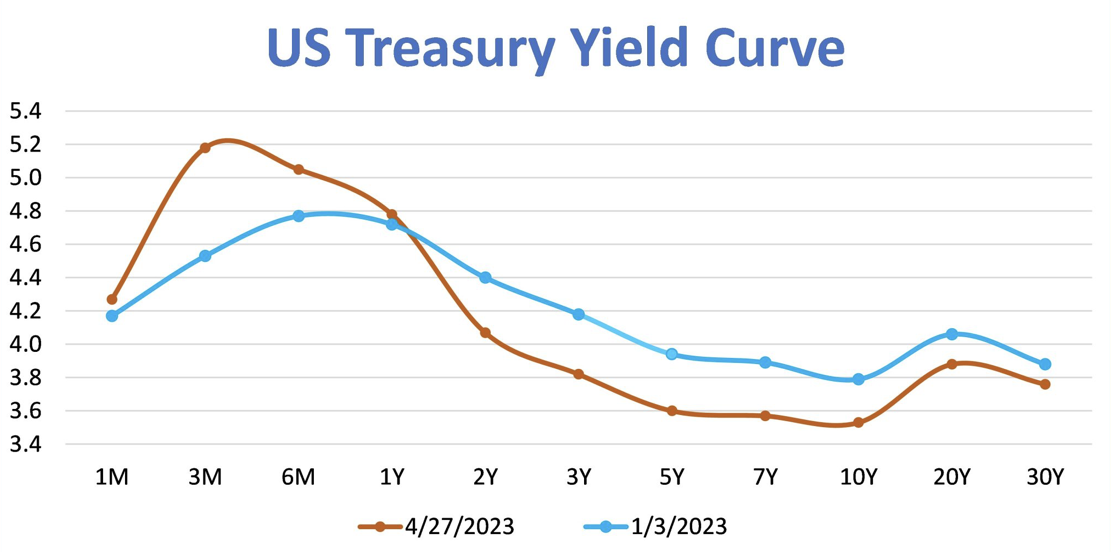A strong liquidity position will help banks weather a recession. Deposit outflows from banks, as noted above, demonstrate the need for increased liquidity. Yields on cash and short-term securities continue to outpace longer dated securities. The current yield curve, shown against that of the beginning of 2023 shows how shorter dated securities yields have increased. Positioning the securities portfolio with more cash and short-term securities will have a positive impact on liquidity ratios.